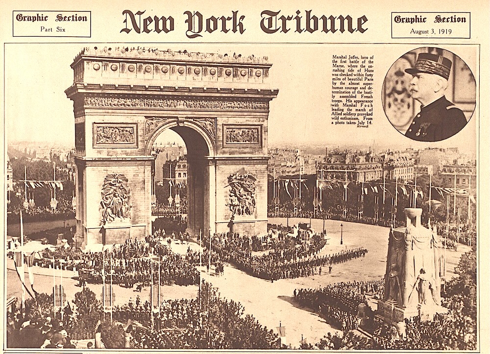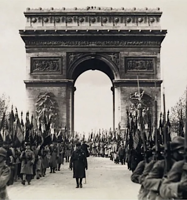 Marshal Joffre and Marshal Foch ride beneath the historic Arc de Triomphe in 1919